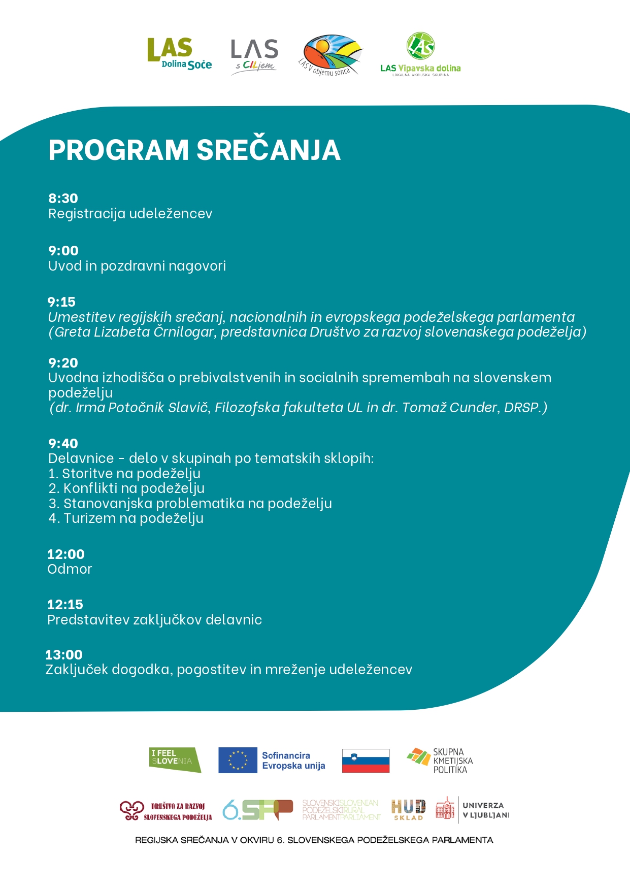 Regijsko srečanje organiziramo kot predpripravo za izvedbo 6. Slovenskega podeželskega parlamenta, katerega glavni organizator je Društvo za razvoj slovenskega podeželja. Od prve pobude za organizacijo podeželskega parlamenta na Švedskem mineva 35 let. V tem času se je tovrsten način organizirane razprave o izzivih podeželja razširil v 17 evropskih držav. Slovenci smo se pridružili pobudi podeželskih parlamentov ob 20. obletnici osamosvojitve v letu 2011. Doslej je bilo izvedenih pet podeželskih parlamentov v obliki dvodnevnih srečanj različnih interesnih skupin, organizacij in posameznikov. Šesti Slovenski podeželski parlament bo potekal v dveh fazah: v prvi fazi bo izvedenih devet regijskih srečanj po Sloveniji, katerih rezultate bomo analizirali in obravnavali na osrednjem nacionalnem dogodku, ki bo potekal junija 2026.